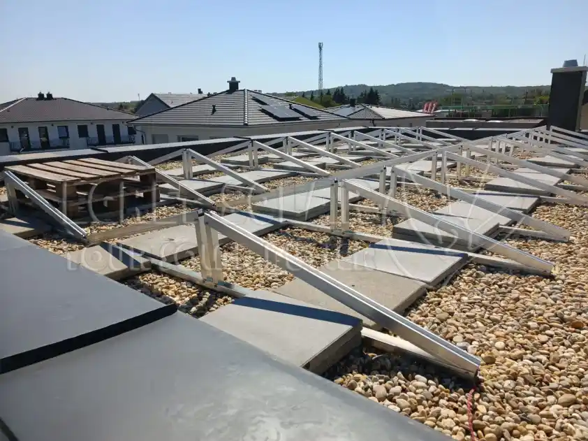 ကွန်ကရစ်တုံးကို ballast tray ပေါ်တင်ပါ။ ကွန်ကရစ်တုံး လေးခုဖြင့် တပ်ဆင်ထားသော ကွန်ကရစ်တုံးတစ်ခုစီသည် အနည်းဆုံး 60 ကီလိုဂရမ် အလေးချိန်ရှိရန် လိုအပ်ကြောင်း သတိပြုသင့်သည်။ Concrete Flat Roof Ballast Solar Mounting System ရှိ ဘိလပ်မြေတုံးများ၏ အတိုင်းအတာနှင့် နေရာချထားမှုများကို အောက်ပါပုံတွင် ပြထားသည်။